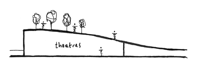 Topography is manipulated to reinforce this concept. Excavated material from the waterway is used to enlarge an existing hill at one end of the site, originally formed from construction rubble. A dialogue between natural and urban geometries defines the character of the spaces.