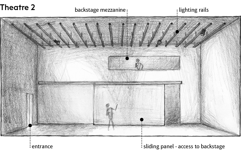 As adaptable spaces, the theatres' only permanent features are the lighting rails and the large sliding doors, which allow large pieces to be brought in from the backstage area.