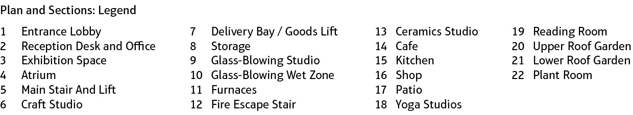 Set in the heart of the city, the building provides space for activities that are conducive to contemplation, and which induce a calm state of mind in the visitor. Studios are provided for various activities including glass-blowing, pottery and yoga.