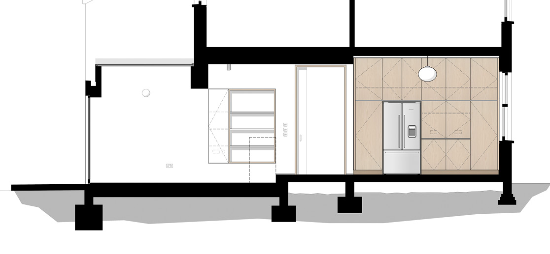 A new 30sqm kitchen and dining room was created by combining two of the existing rooms with a new rear extension.