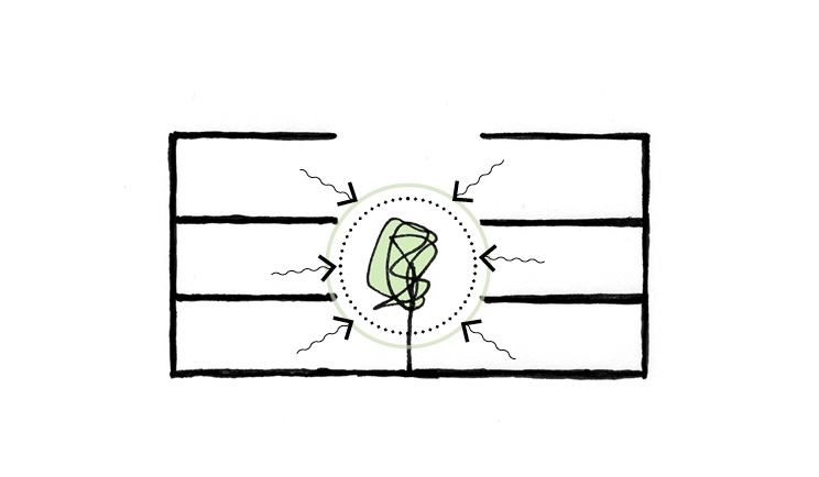Order within chaos: the backs of the surrounding buildings are disordered in their form. The proposal creates a calm and ordered space within, centred around a three-storey atrium.